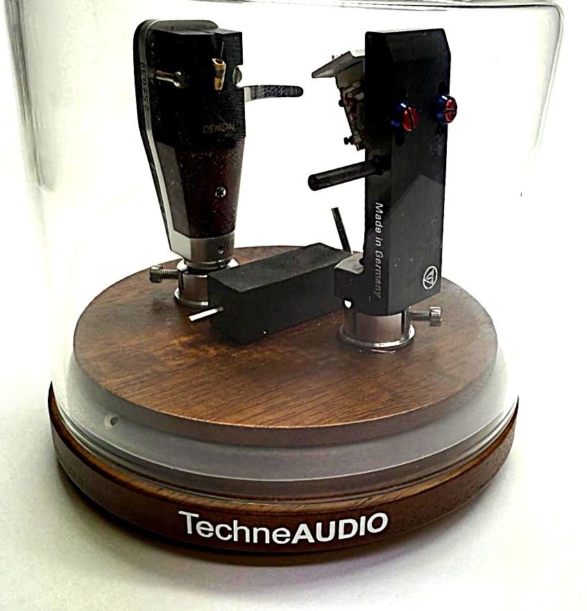 Cartridge Keeper TechneAudio exklusiv für 2 Tonabnehmer mit Headshell, ALU Aufnahme mit Lock Funktion , Glasabdeckung , Nussbaum Bodenplatte, D =110mm x H =100mm