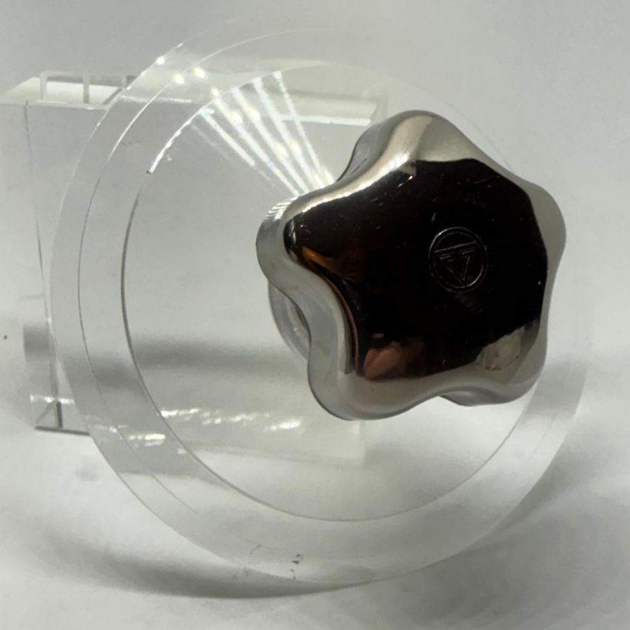 Plattenklemm 3-teilig "klar transparent"-Teller, verchromter Messing-Griff, Messingkonus, D= 90mm, H= 40mm, 65g