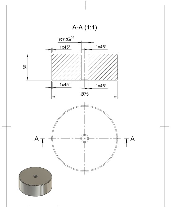 Plattengewicht aus Kristallglas, zylindrisch, 1mm Fase, D=75mm, H=30mm, Gewicht=300g