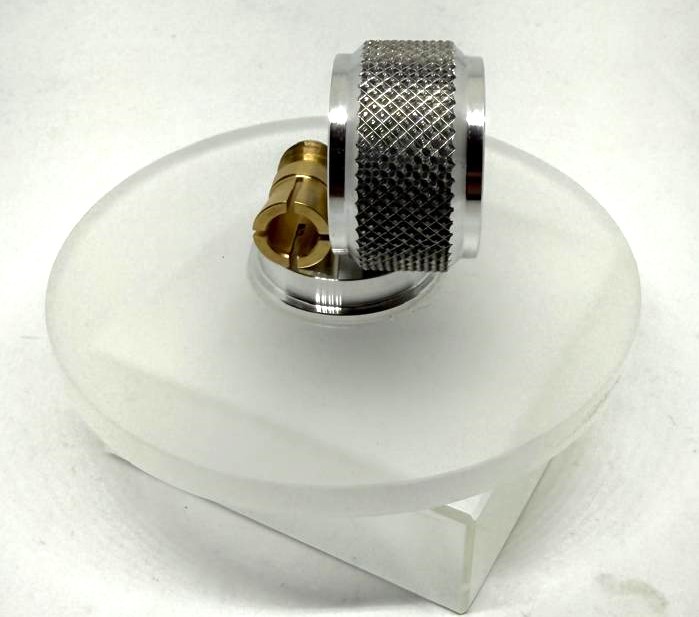 Plattenklemme 3-teilig "klar transparent"-satinierter PLEXIGLAS®-Teller, Messingkonus, AL-Rändelgriff