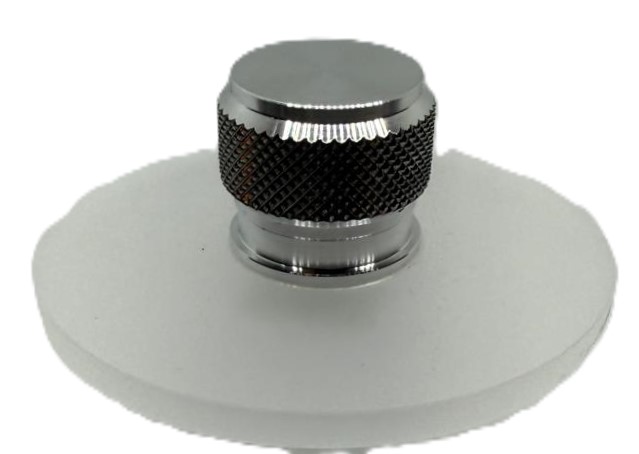 Platter clamp „clear transparency“ made of satinised PLEXIGLAS®, brass cone, aluminium rotary knob.