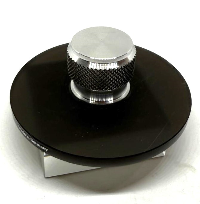 Platter clamp „clear transparency“ made of satinised PLEXIGLAS®, brass cone, aluminium rotary knob.