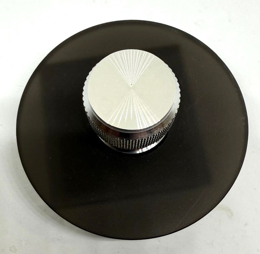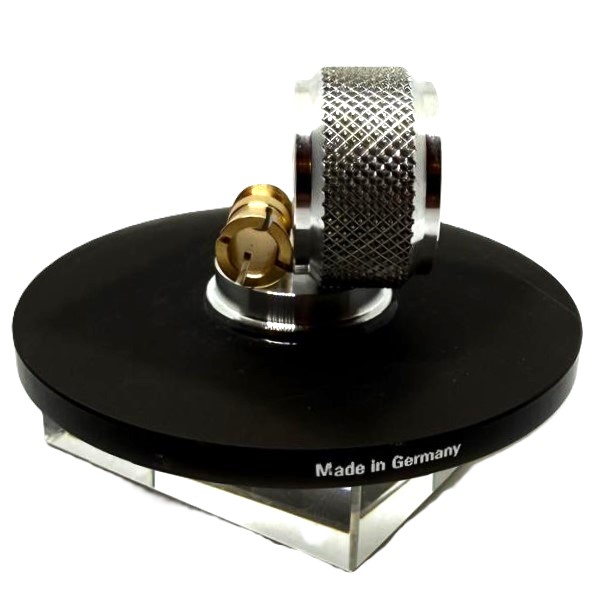 Plattenklemme 3-teilig "schwarz"-satinierter PLEXIGLAS®-Teller, Messingkonus, AL-Rändelgriff
