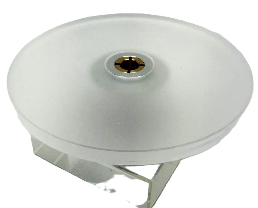 Plattenklemme 3-teilig "klar transparent"-satinierter PLEXIGLAS®-Teller, Messingkonus, AL-Rändelgriff