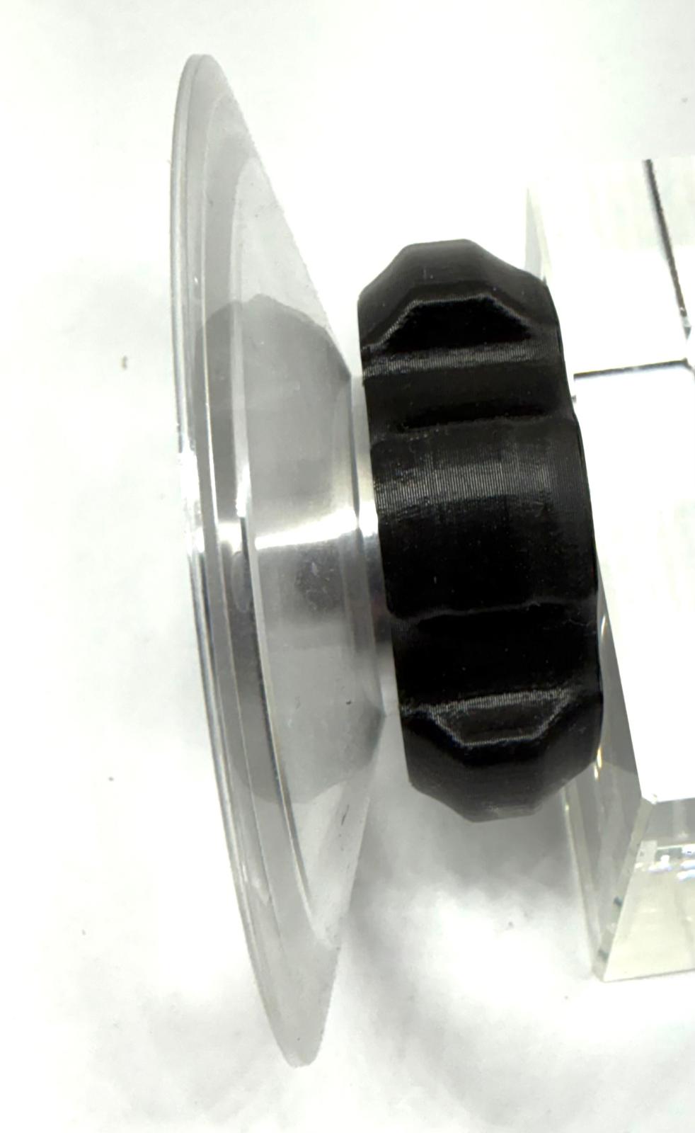 Platter clamp with high-quality plastic platter, brass cone, ergonomical rotary knob.